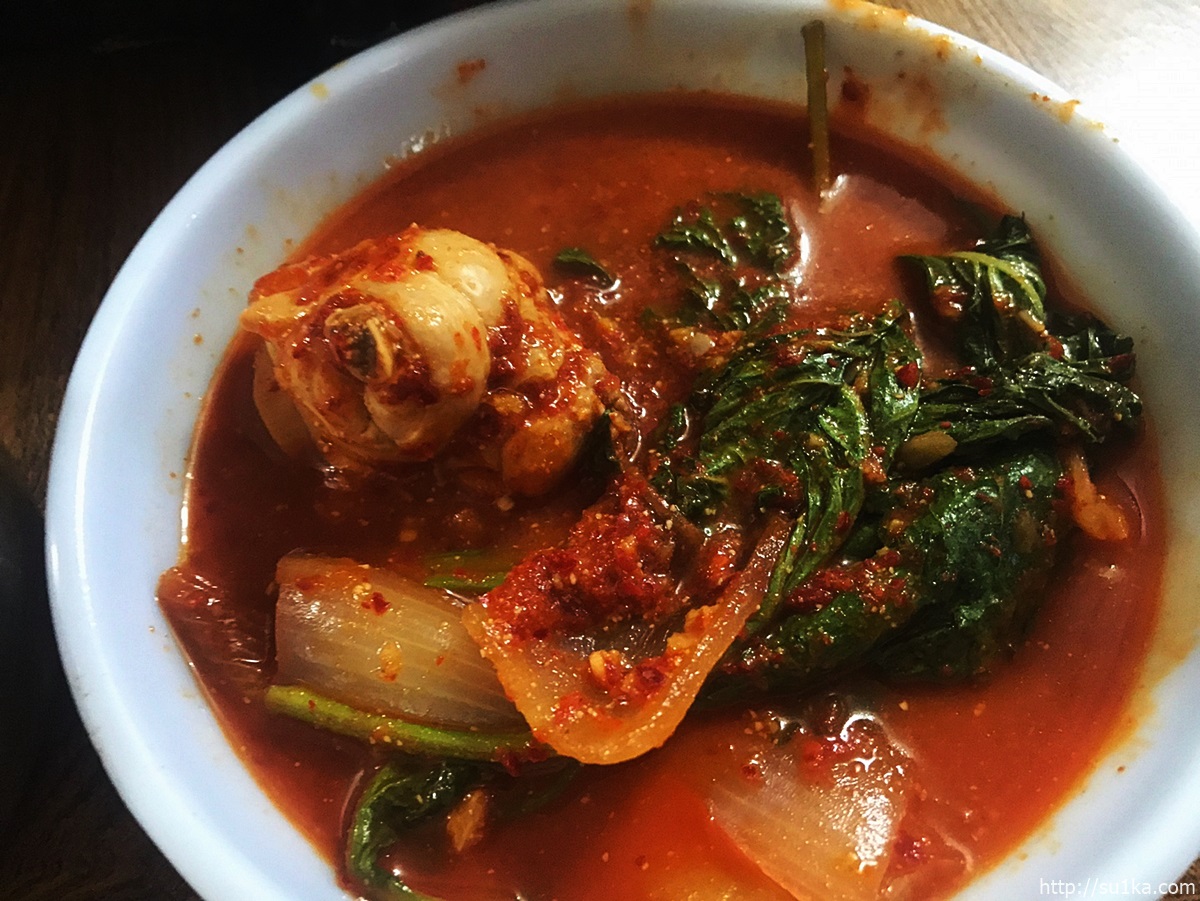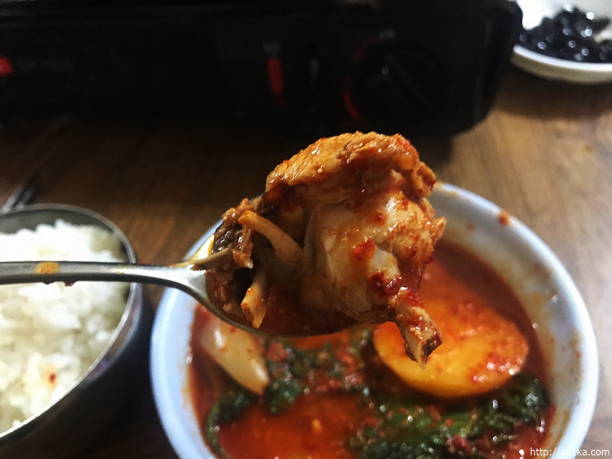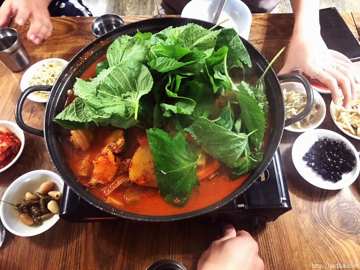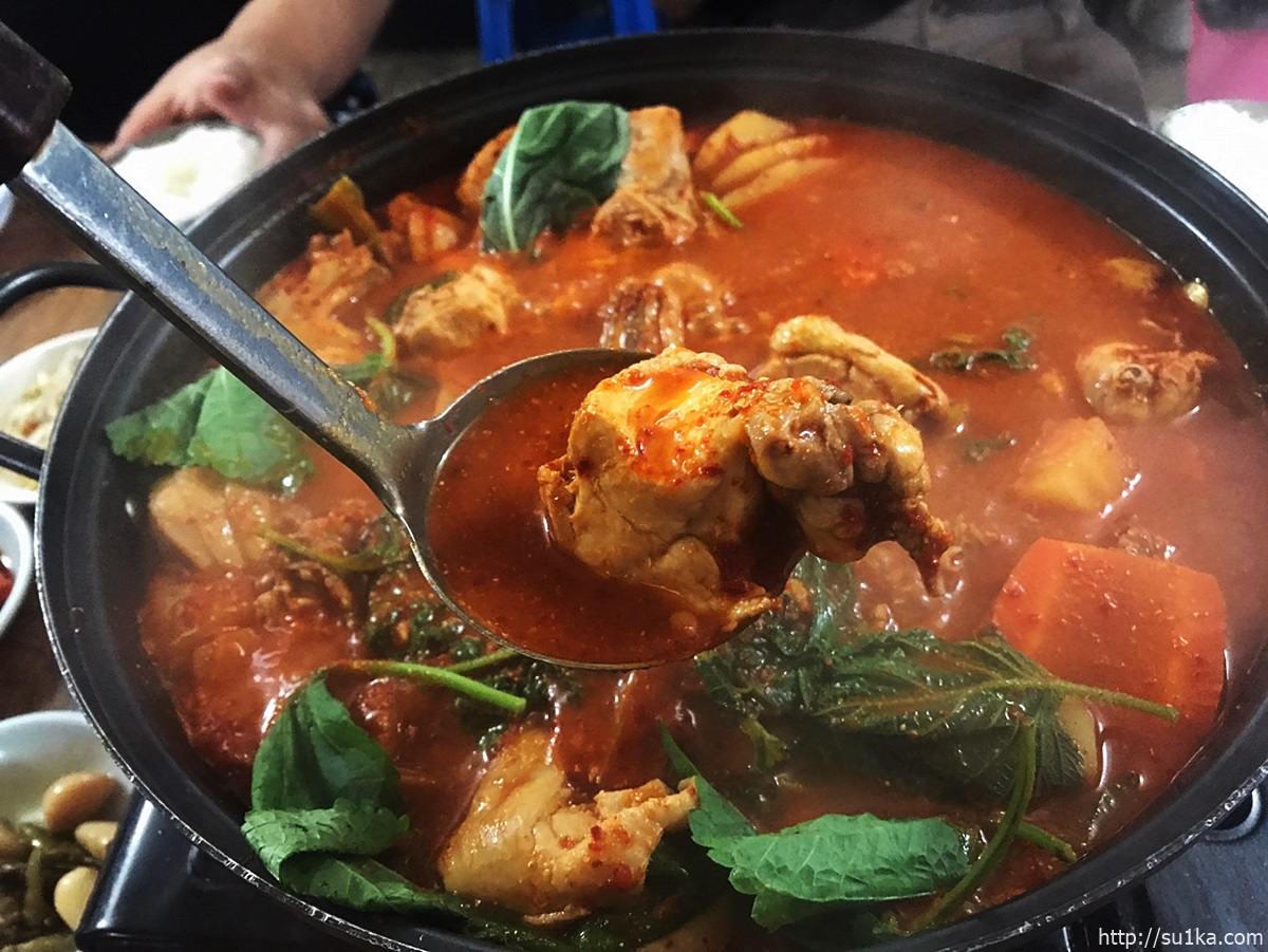 깻잎이 가득 들어간 닭볶음탕입니다. 닭도리탕이나 닭볶음탕 어떤것이 맞냐에 대한 궁금증은 잠시 접어두고 이모네에서 이 맛있는 음식을 즐기기로 합니다.
