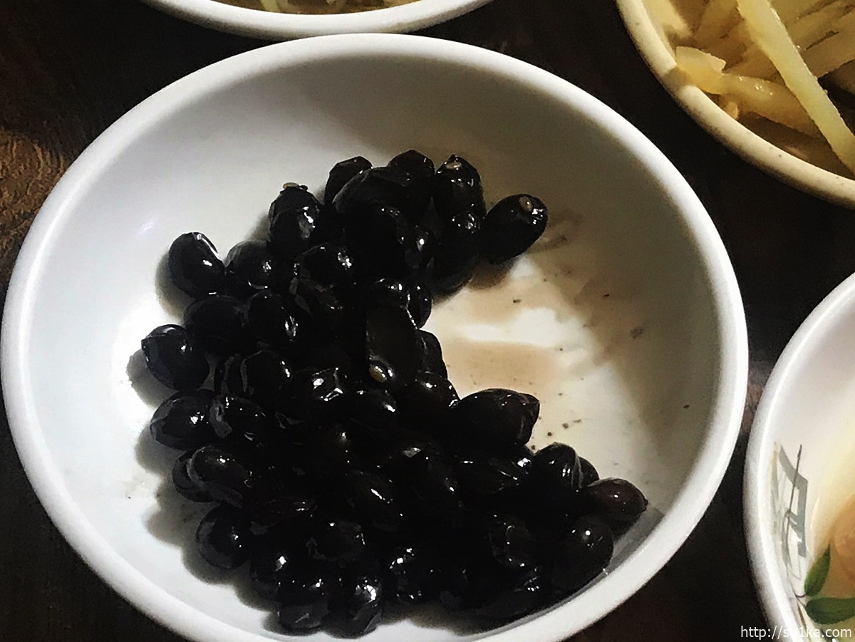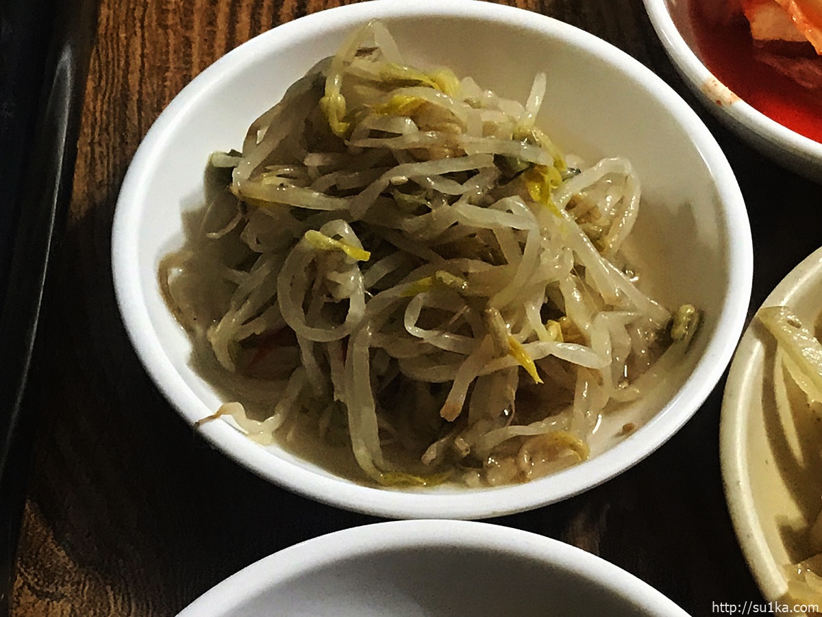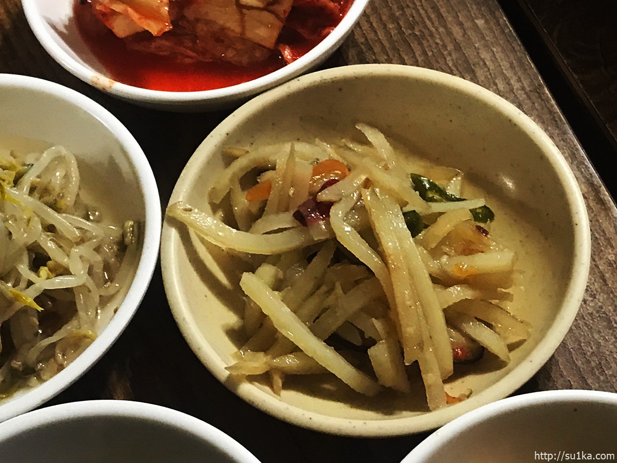 여러가지 밑반찬인데요 한식느낌이 나는 감자반찬, 숙주나물, 콩장 등이 있었습니다
