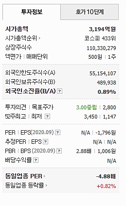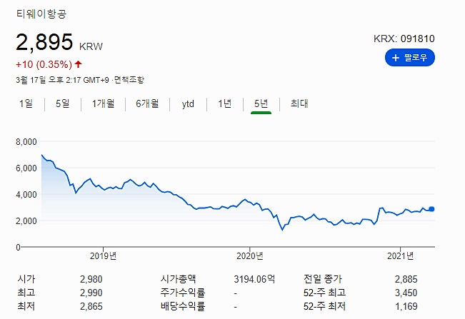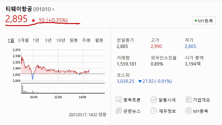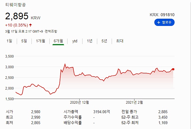 티웨이항공의 주가는 1주당 2,895원(2021년 3월 17일 14,32 장중가 기준) 정도인데요 외국인소진률은 0.89%, 시가총액은 3,194 억 가량입니다.