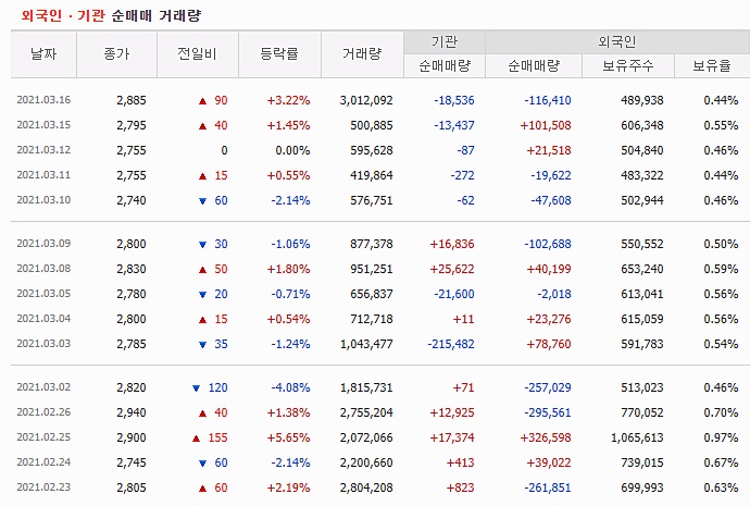 기관 외국인 보유율이 2021년 2월 23일 기준 0.63%에서 2021년 3월 0.44%정도로 보여지고 있습니다