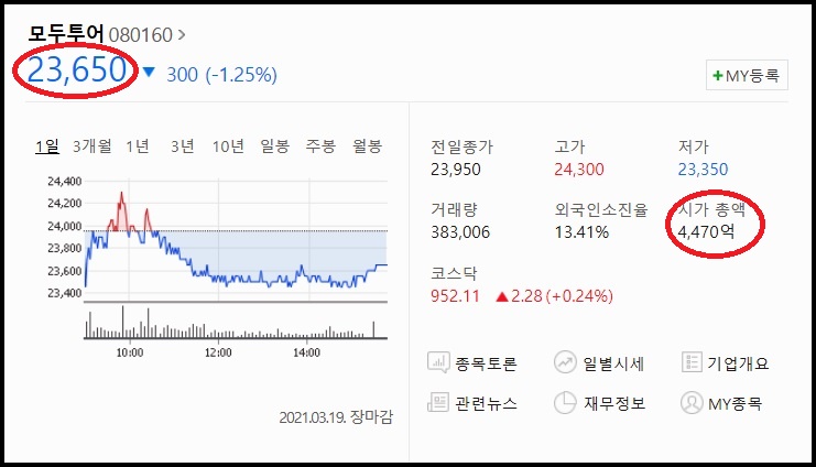 모두투어의 주가는 2021년 3월 19일 장마감 기준 주당가격 23,650원 입니다. 외국인소진률은 13.41%이고 이날 0.24%오른 채로 마감을 했었습니다. 모두투어는 시가총액이 4천 4709억에(3월 19일 장마감기준) 달하는 기업입니다.