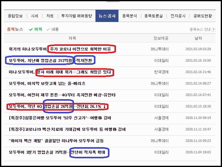 모두투어 관련 뉴스입니다. 주가가 코로나 이전으로 회복한것처럼 보이지만 그래도 영업손실은 빼놓을수 없는 모두투어의 숙제 같습니다. 이렇듯 국내여행&해외여행 관련주에 관심이 있으시다면 알아야할 대장주중에서 모두투어를 꼽아봤습니다.
