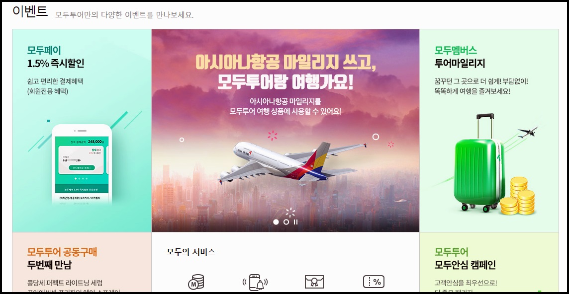 아시아나항공 마일리지를 사용하고 모두투어와 여행가자는 이벤트 화면이라든가 투어마일리지, 즉시할인, 공동구매 등의 서비스를 볼수가 있었습니다