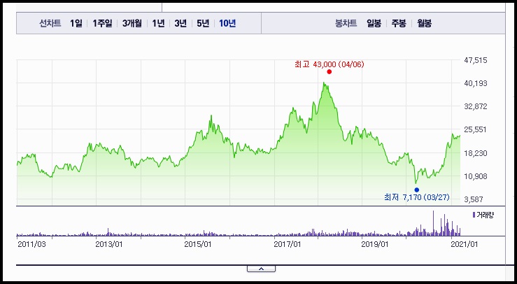 모두투어의 10년치 차트입니다. 메이저 여행사로서 차근차근 발전을 해오던 기업이었는데 코로나19라는 악재를 맞고 주가가 곤두박질쳐 7000원대까지 떨어졌던 흑역사도 있었습니다. 하지만 아직 코로나가 종식된것도 아니지만 많은 주가회복을 보여주었고요 앞으로 어떻게 될지는 아무도 예측할 수 없는것이지만 낙관적인 주가전망을 하시는 분들이 모두투어같은 여행 관련주에 많은 관심을 보이고 있지요.