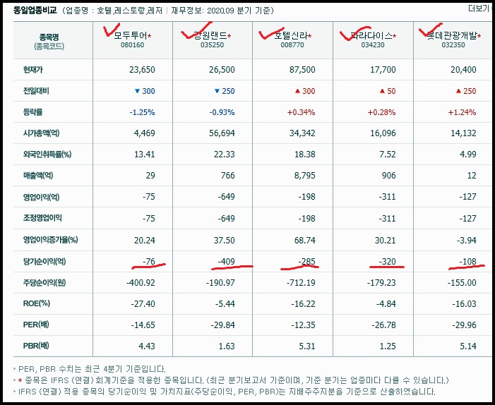 동일업종, 비슷한 계열 업종으로는 강원랜드나 호텔신라, 파라다이스, 롯데관광개발 등을 보여드릴수 있고요 당기순이익이나 주당순이익이 -를 보이는 부분이 많습니다. 여행 관련주가 단순히 항공사만 있는것이 아니기에 이렇게 엔터테인먼트적인 역할을 담당하는 여러회사가 있다는것을 참조하시는 방법이 있습니다.