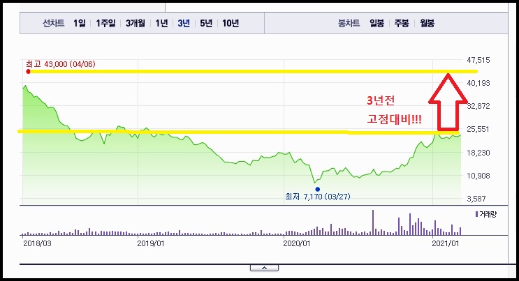 3년차트를 보겠습니다. 최저는 7,170원까지 갔었고요 현재는 3년전의 고점에 대비해서는 낮아진 상태이기에, 코로나가 종식된다면 이전과 같이 코로나가 없었던 때와 마찬가지로 활발히 국내여행과 해외여행에 다니는 사람들이 많아지니까 모두투어의 주가 전망을 낙관적으로 볼수 있을것 같고요 코로나가 종식되지 못한다면 3년전의 고점을 극복하기에 많은 어려움이 따를수 있습니다. 많은 사람들이 백신문제에 관심을 가지는것 역시 같은맥락인데요. 원래 우리가 그런삶을 살았던 것처럼 여행및 모든것이 자유로워질 그날로 회귀하기만을 소망하는 것입니다.