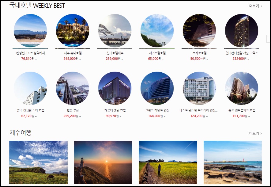 모두투어 홈페이지 메인화면에는 여러 국내호텔 리스트를 만나볼수 있었습니다.