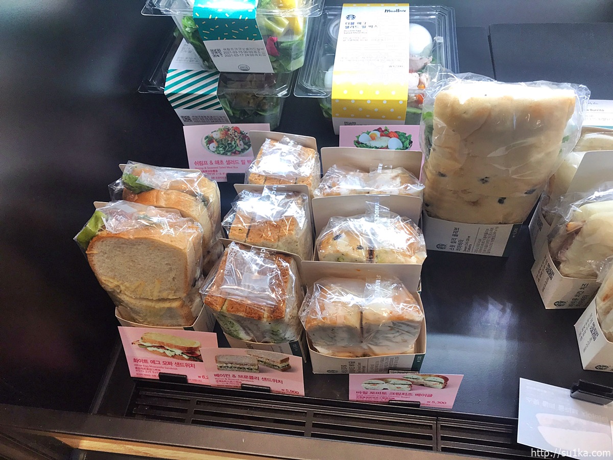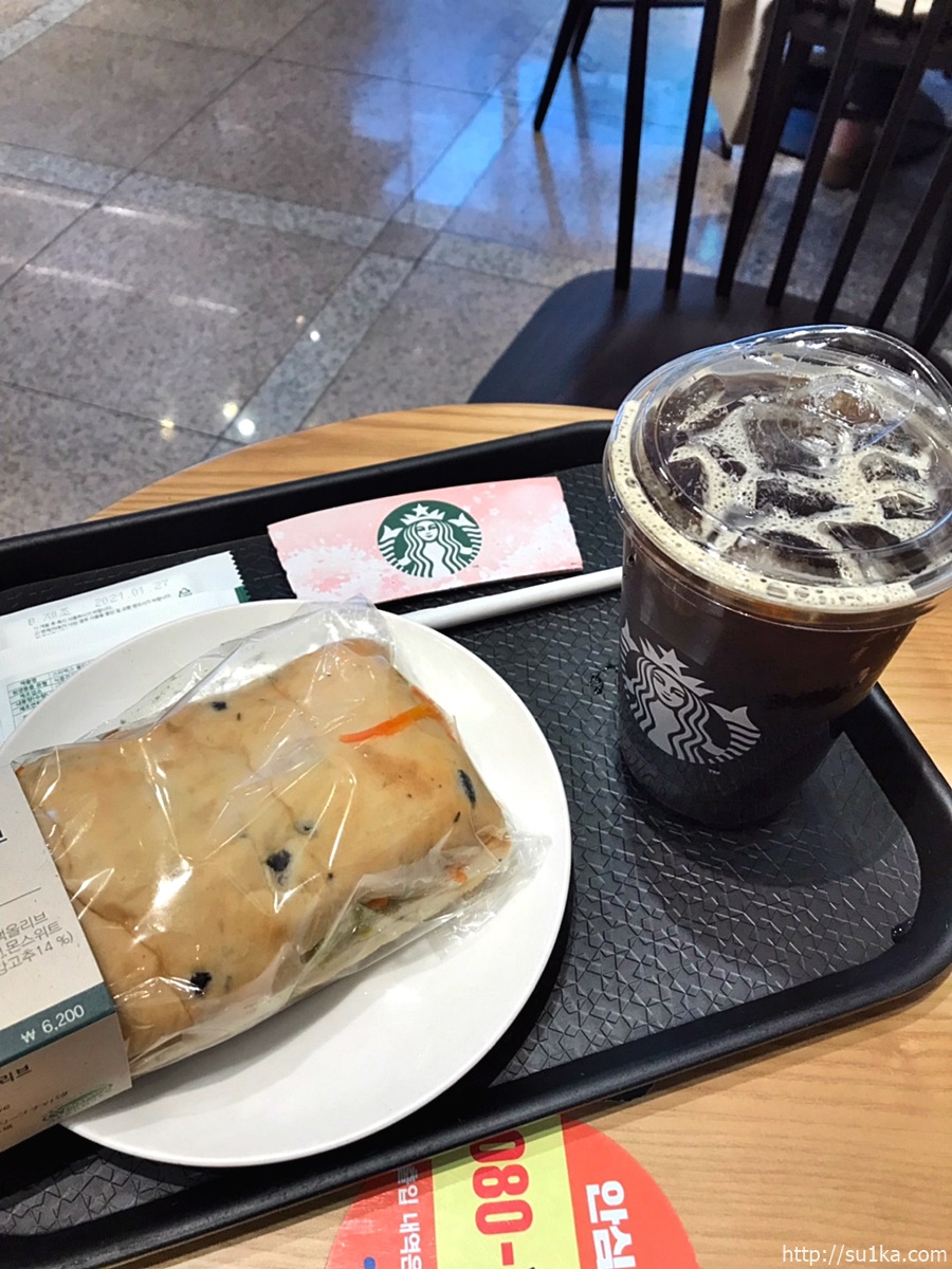 원래 케이크랑 음료 기프티콘을 받았는데 그냥 샌드위치에 아메리카노로 바꿨어요. 추가금은 좀더 냈는데요 밥이 땡겨서 별수 없었어요. 가격은 좀 사악한것 같지만 그래도 쉬러 올때 스타벅스만한 데가 없더라고요.