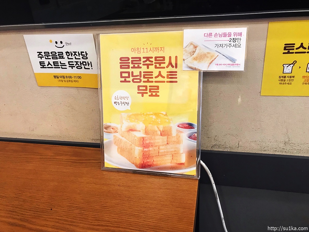 아침 11시까지 음료주문시 토스트가 무료인 지점이 있습니다.