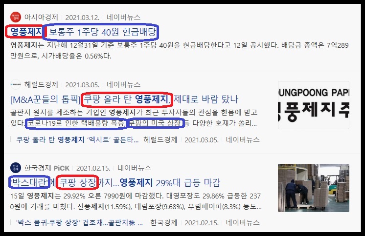 골판지 수요와 맞물려 사람들의 관심을 모은 영풍제지 쿠팡 이슈가 있었다는 사실도 알 수 있었습니다.