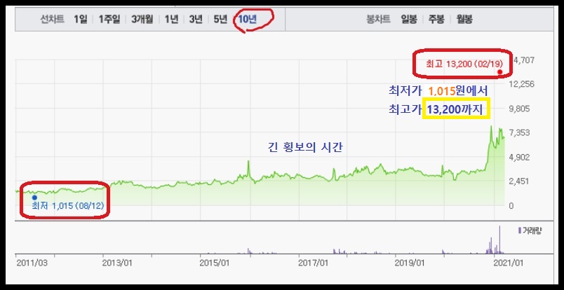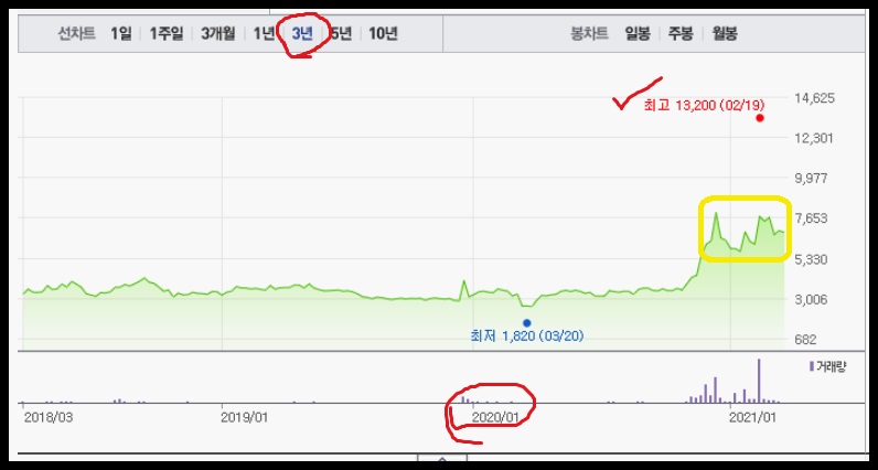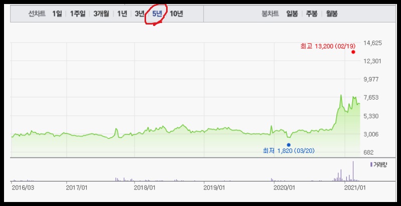 3년 사이에 주가가 최저 1,820 원에서 박스권 횡보기간을 거쳐 최고 13,000(2월 19일기준)까지 올랐던 차트가 목격됩니다. 골판지관련주및 골판지 제조업체들이 주목을 받고난후의 주가변동상황을 확인할수가 있습니다.
