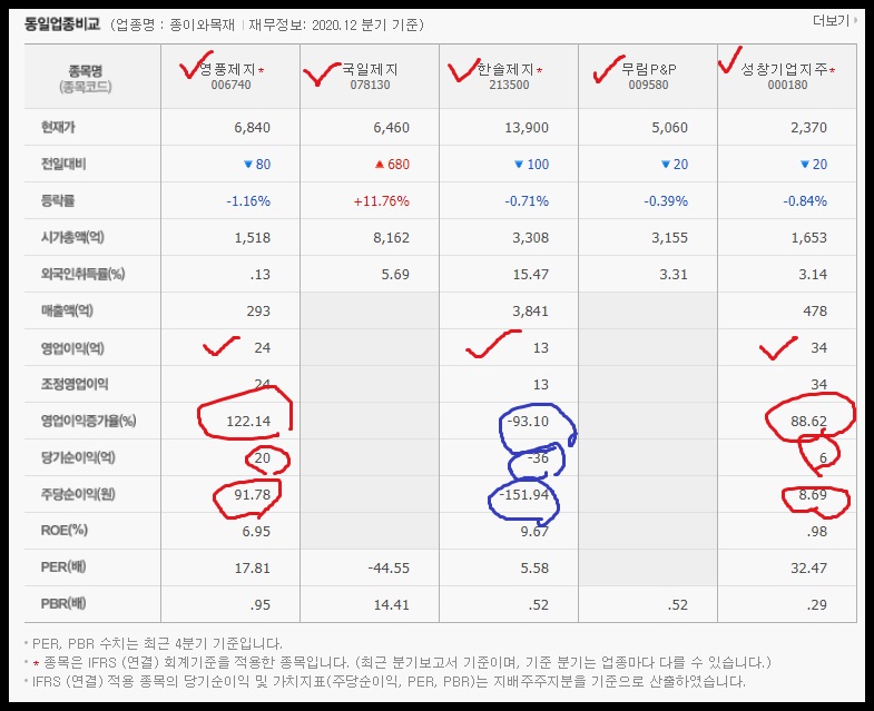 종이와 목재에 관련한 택배박스 관련주로 영풍제지, 국일제지, 한솔제지, 무림P&P, 성창기업지주 등이 있는데요. 영업이익증가율과 당기순이익, 주당순이익이 -인 회사도 있습니다. 이와 비교해서 회사의 재무상태를 확인해 볼 수가 있겠습니다.