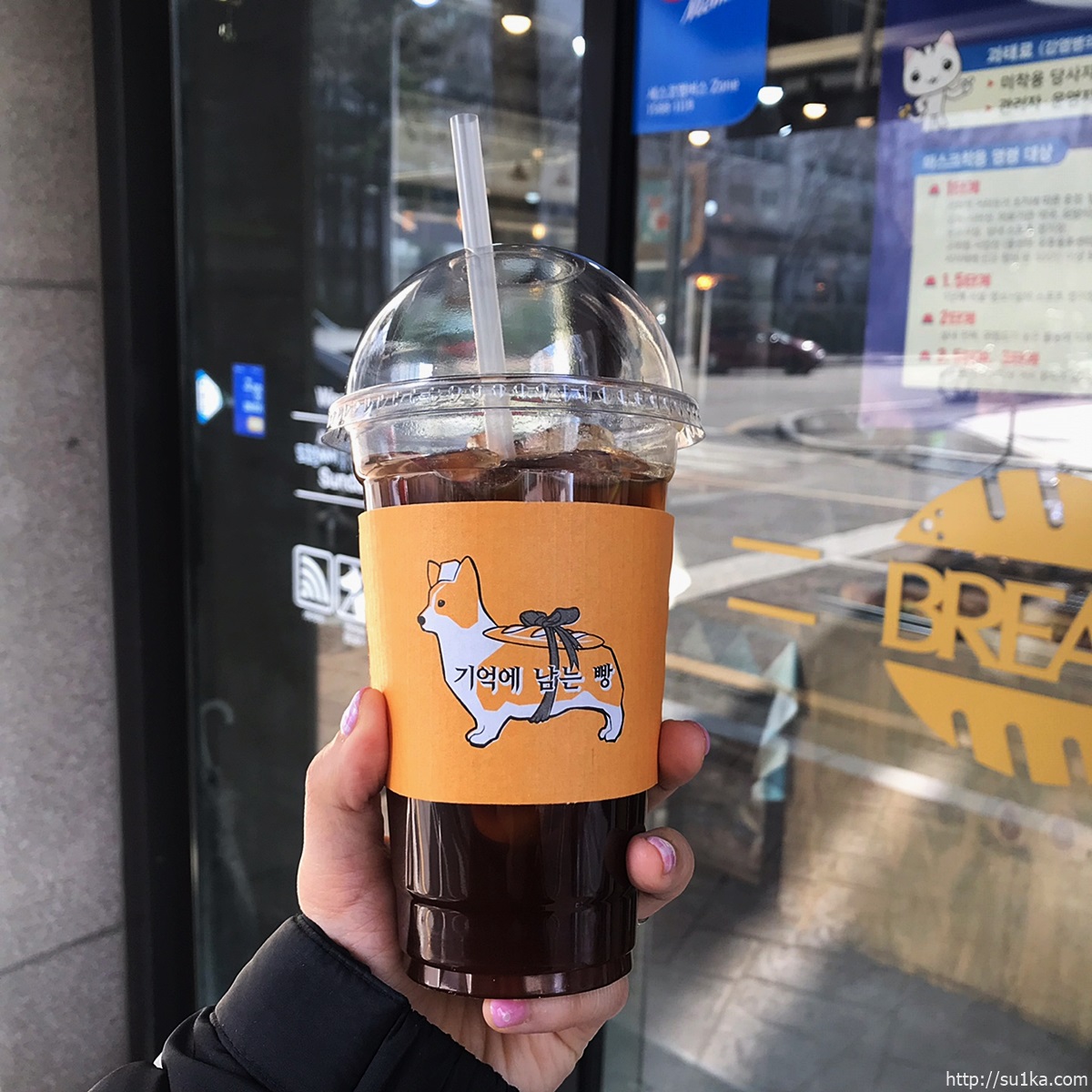 커피의 홀더부분에는 기억에 남는 빵의 시그니처 캐릭터 웰시코기 강아지가 그려져 있는데요 넘나 귀엽죠