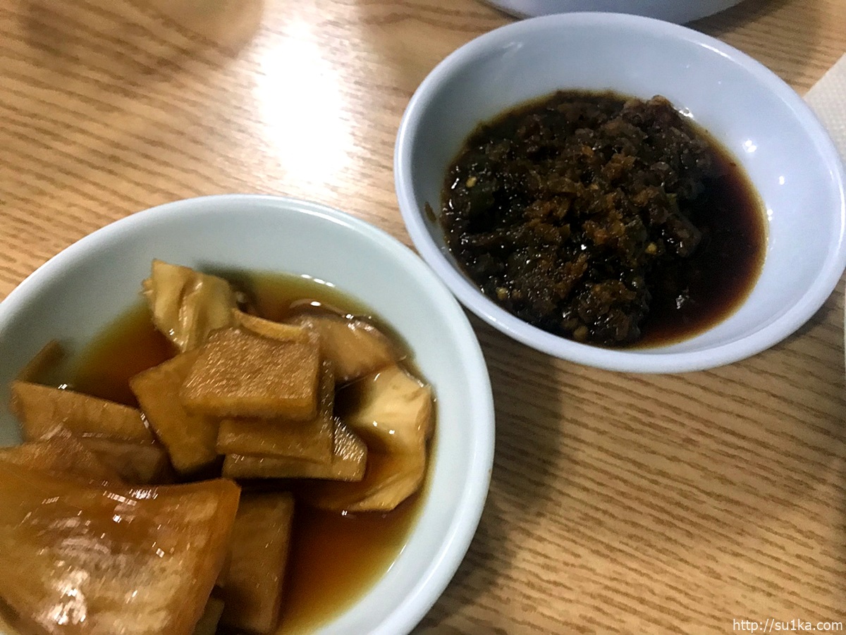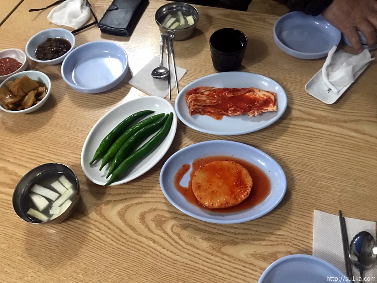 먼저 밑반찬부터 차려주시는데요 큰 고추와 김치 그리고 동치미국물이 보입니다.