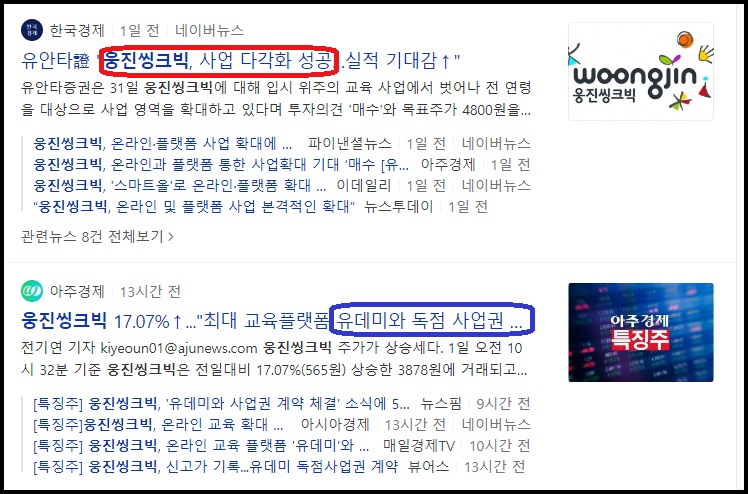이슈는 웅진씽크빅이 교육플랫폼 중 <유데미>라는 회사와 독점사업권을 펼쳤다는 소식입니다