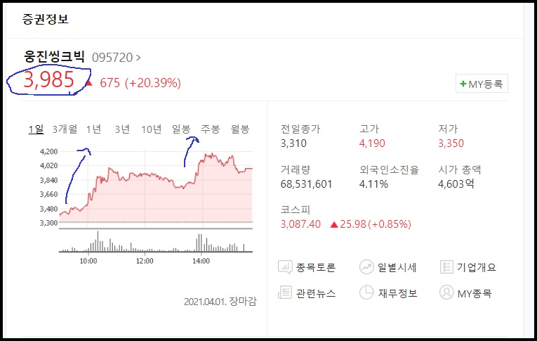 2021년 4월 1일 장마감 기준으로 웅진씽크빅 주가는 3,985원인데요.