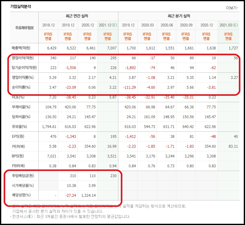 하단에 체크해둔 부분은 웅진씽크빅 배당금 부분인데요 주당배당금은 1~300원선이었으며 시가배당률과 배당성향도 확인 가능합니다.