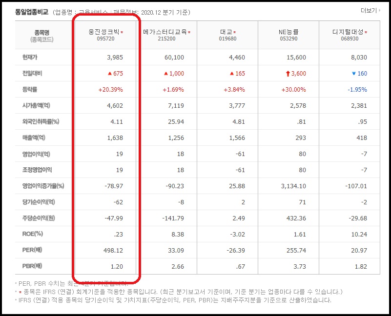 동일업종비교표입니다. 다른 교육관련주로는 메가스터디교육, 대교, NE능률, 디지털대성 회사등이 있겠습니다