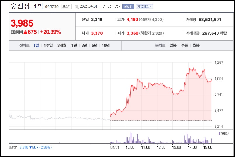 2021년 4월 1일 장마감 기준으로 웅진씽크빅 주가는 3,985원인데요.