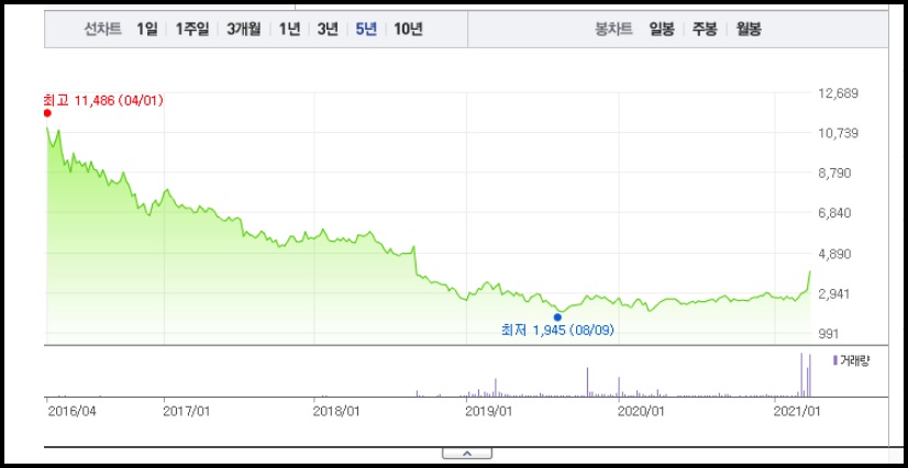 최저가는 1,945원이었고, 2021년 4월 현재 이전 최고가에는 못 미친 가격이나 근시일에 꽤나 많은 급등세를 보여주었네요.