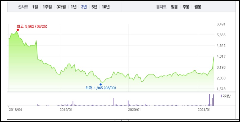 오래된 기업이다보니 3년차트를 보겠습니다. 최고가 5,962원이었던 적이 있는데요(2018년쯤)