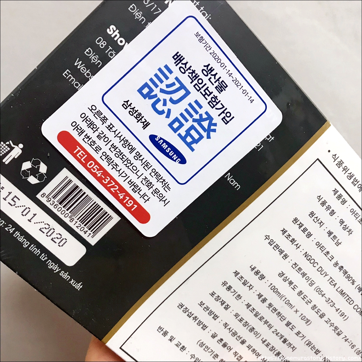 생산물 배상책임보험 가입이 된 제품이고요 삼성화재 마크가 눈에 뜨입니다. 액상차 형태로 먹을수 있어서 정말 편리하더라고요. 물에 타 먹는것입니다.