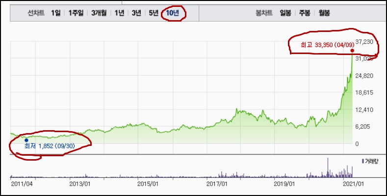 10년치 차트인데요 무려 2011년 1,852 우너에서 33,350으로 서서한 오름세를 겪고 현재의 주가까지 고공행진한 차트를 볼수 있습니다. 오래 가지고 있었으면 투자수익률이 꽤나 높았을것 같네요.