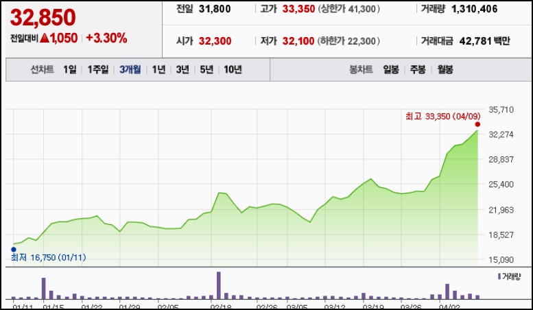 3개월 차트입니다. 꾸준히 올라서 3개월동안 16,750(최저가)에서 33,350까지 오른 모습입니다.