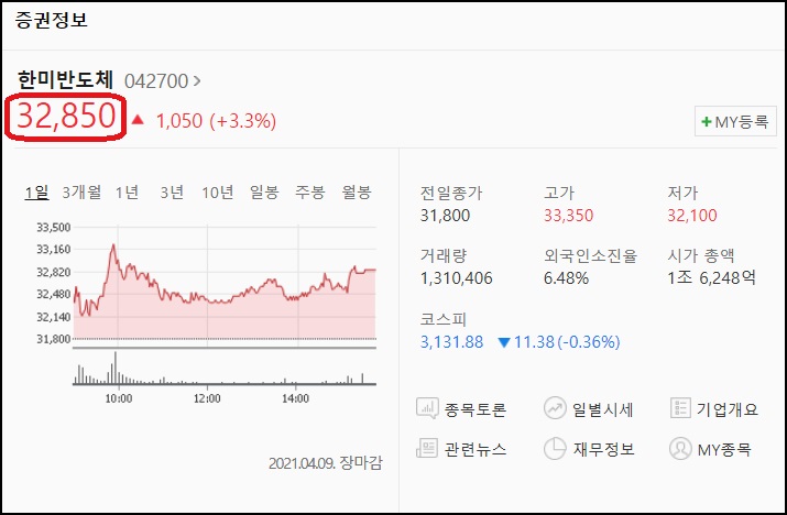 한미반도체의 현재주가는 1주당 3만 2천 850원(21년 4월 9일 장마감기준)입니다.