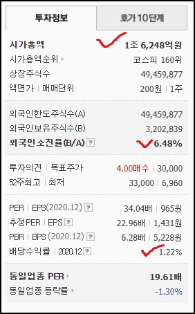 시가총액은 1조 6,248원이며 외국인소진율은 6.48%이고, 시가총액순위로는 코스피 160위입니다. 배당수익률이 1.22%인 주식이며 배당수익률과 배당금이 있는 주식입니다.