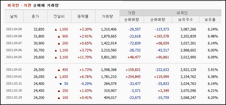 외국인이나 기관 순매매 거래량과 등락률인데요 외국인 보유율은 6%대를 기록하고 있으며 거래량은 3월 30일 이후 증가한 모습입니다.