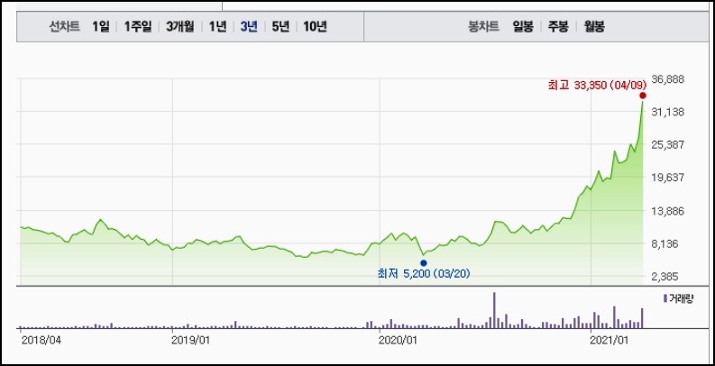 3개월 차트입니다. 꾸준히 올라서 3개월동안 16,750(최저가)에서 33,350까지 오른 모습입니다.