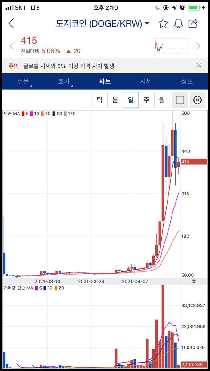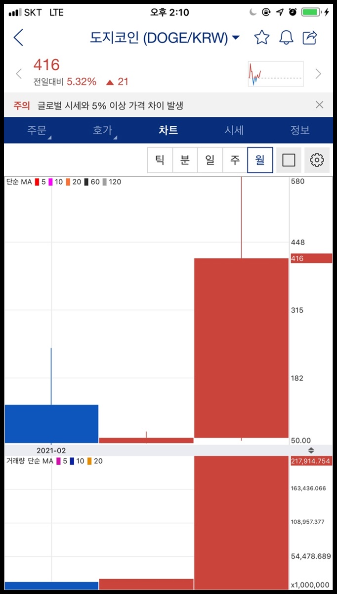 실제로 일/월단위 차트와 시세를 확인해보니 도지데이에 급등하고 폭락한 차트가 그려집니다.