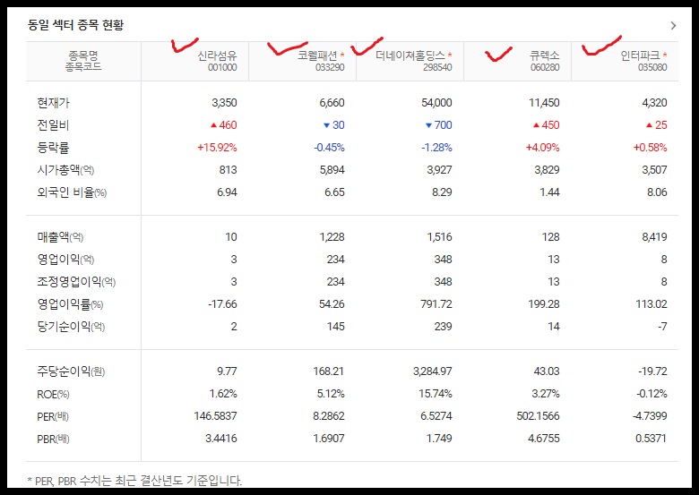 신라섬유와 아울러  코웰패션, 더네이쳐홀딩스, 큐렉소, 인터파크의 현재가 및 시총, 매출액, 영업이익, 주당순이익 등을 확인할수 있는 표입니다. 확인해보시면 신라섬유는 영업이익률에서 감소가 보여지며 등락률은 4월 21일 현재 가장 크다는 사실을 알 수 있겠습니다.