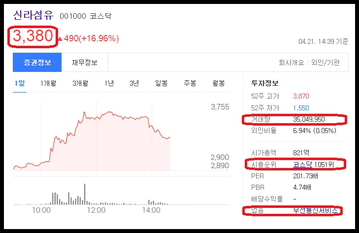 신라섬유의 시가총액은 821억으로 코스닥 1051위이며(2021년 4월 21일) 현재 주가는 3,380원입니다. 외인비율은 6.94%라고 하며 장중 16.96%오르며 관심을 받았던모습또한 알 수 있겠습니다.