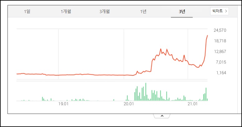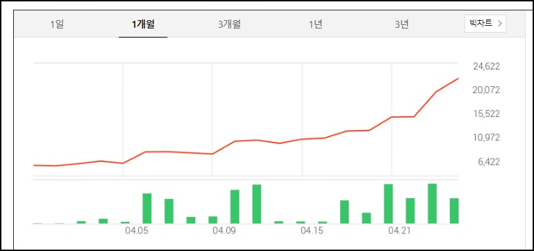 4월부터 1개월간 꾸준히 올라서 주가가 2만원을 넘었습니다