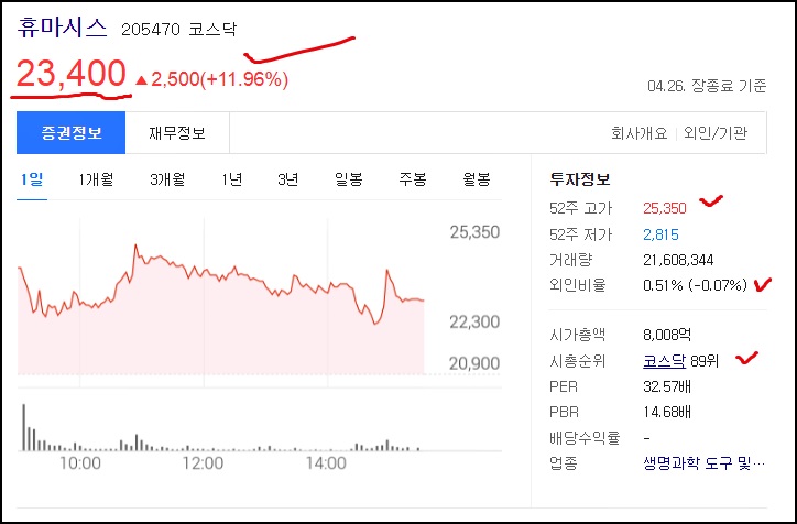 휴마시스의 1주당 주가는 23,400원이고요, 11.96% 상승하면서 마무리했습니다 (2021-4-26 장마감기준)