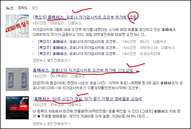 이처럼, 코로나 자가진단 키트 관련주로도 많이 언급된 주식이 바로 휴마시스였는데요. 간단히 설명핻릐자면 코로나 검사할때 쓰이는 키트를 개발하는 회사입니다