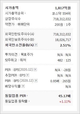 코스닥 554위정도 입니다. 배당금은 없으며 외국인 소진률은 2.51%정도 입니다.