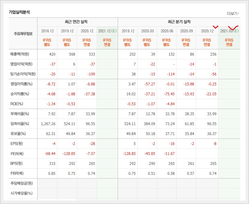 지금은 1주당 253원으로 동전주가 되었습니다 (2021년 4월 29일 장마감기준)