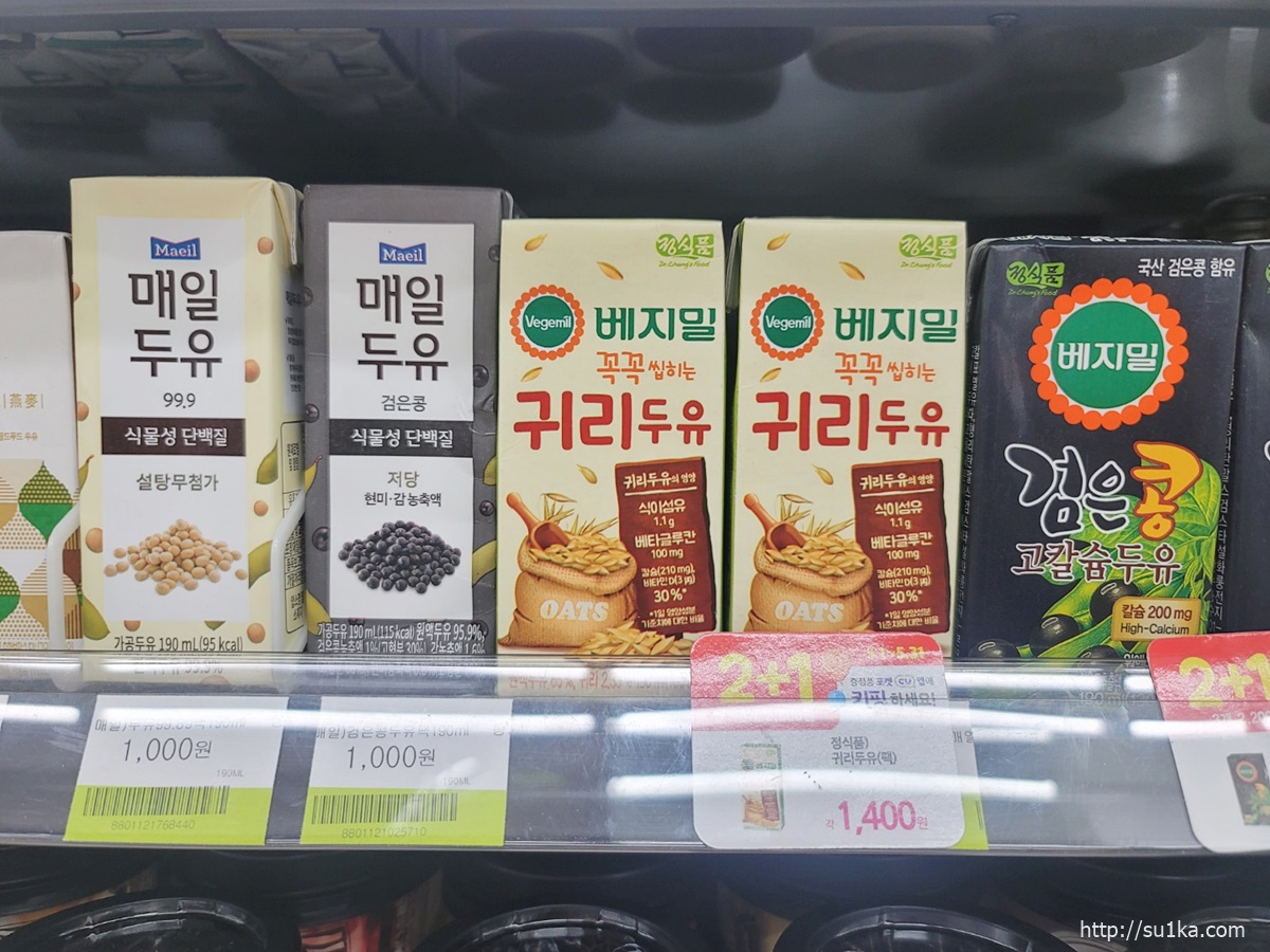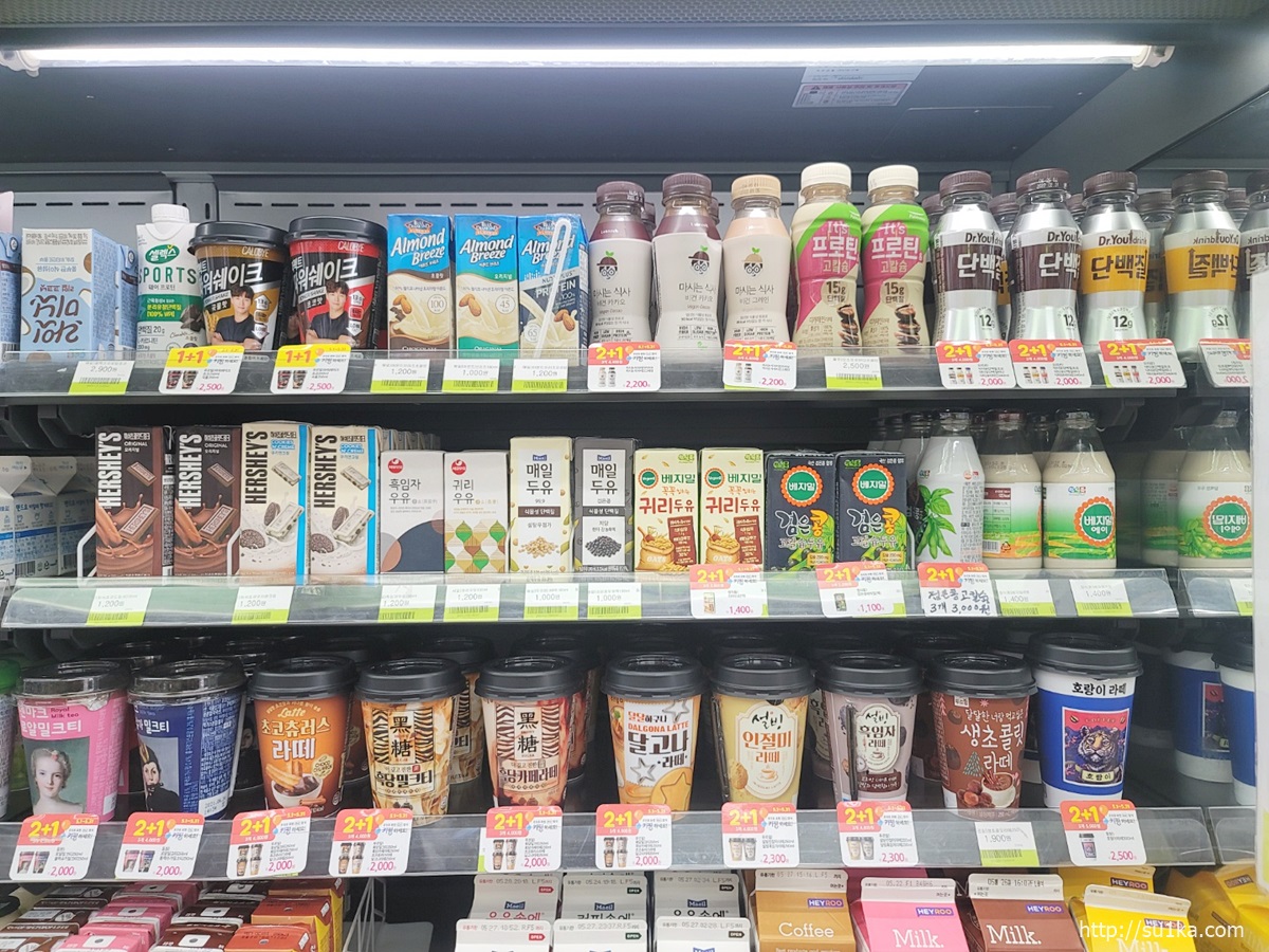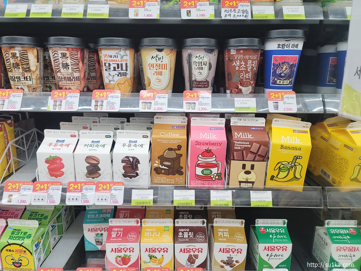 편의점 우유 가격이 비싸다는 편견이 있는데 2+1이나 1+1을 잔뜩 하고있어서 은근 저렴합니다.
