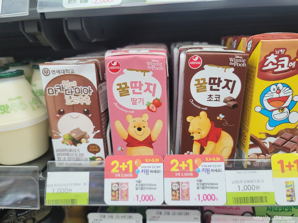 서울우유 꿀단지 딸기와 초코는 개당 가격 1000원이며 2+1행사중이었고요