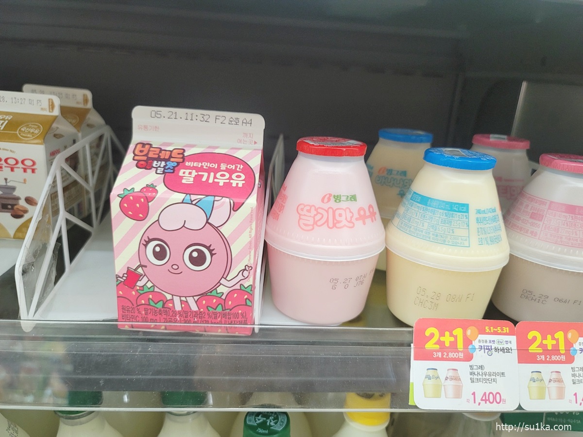 비타민이 들어간 딸기우유와 빙그레 딸기맛 우유가 있었어요