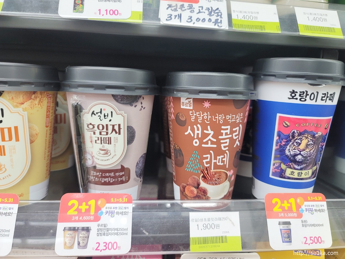 호랑이 라떼는 2+1행사중이며 하나에 2500원이고 3개에 5000원꼴입니다