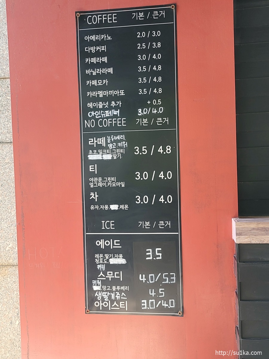 핫기준이고요 아메리카노 기본 2000원 큰거 3000원, 다방커피는 기본 2500원 큰것 3800원입니다
