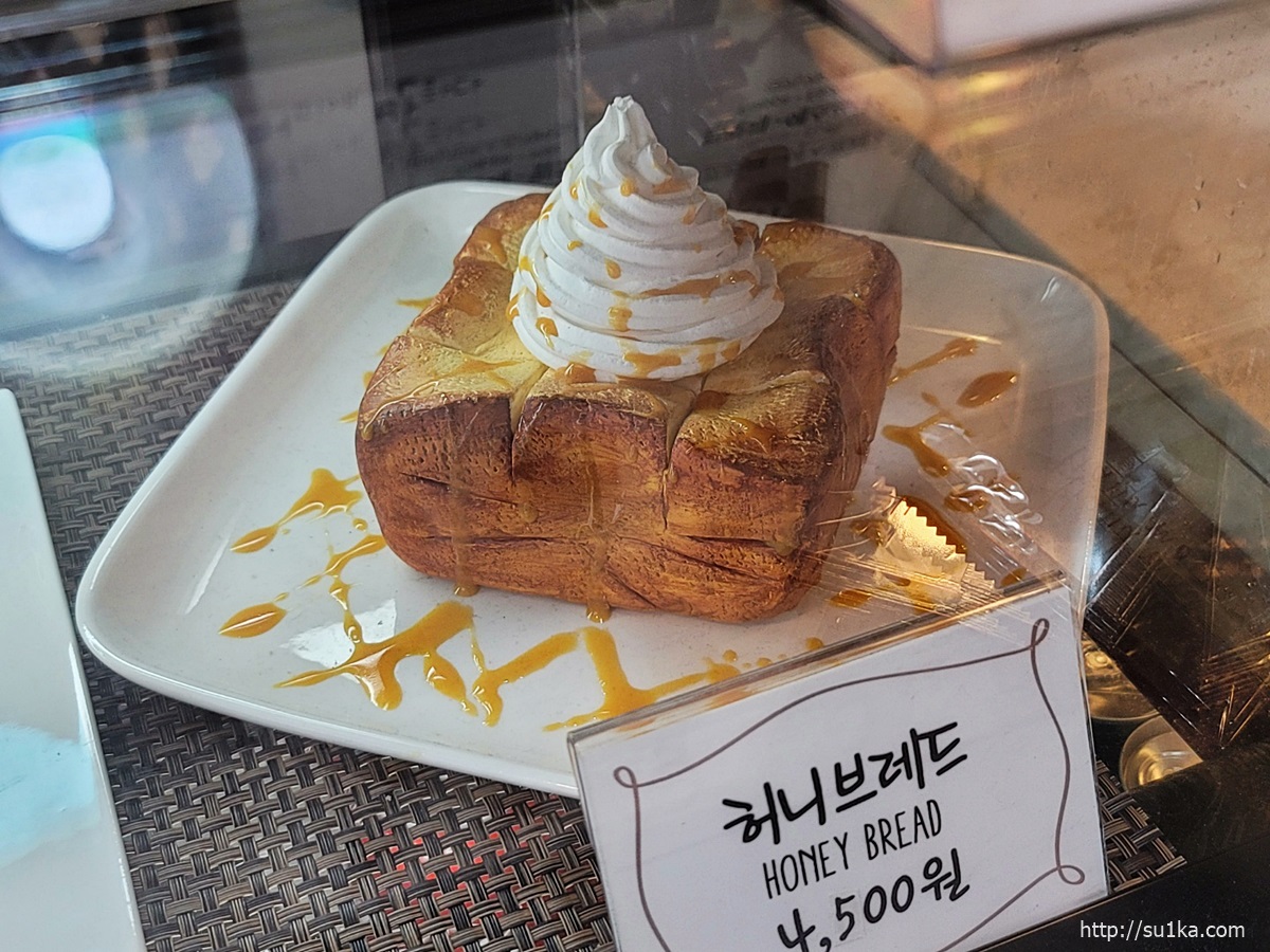 커피에반하다 표 허니브레드 모형입니다. 이렇게 크림을 함뿍 올려준 두툼한 허니브레드인데요 요즘 브레드 파는곳이 별로 없던데 여기서 다 보게 되었습니다.