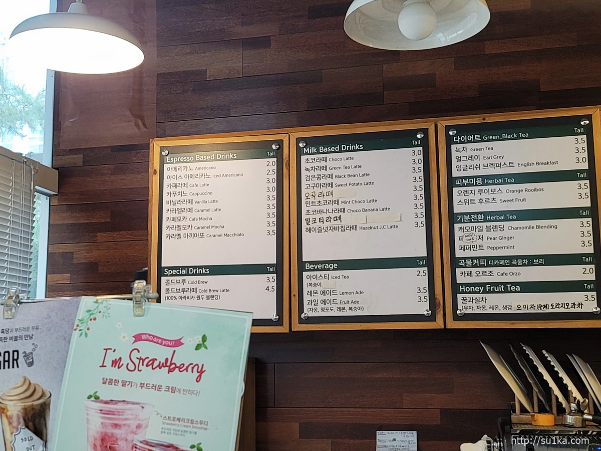 톨사이즈 기준으로 아메리카노 2000원, 아이스 아메리카노는 2500원, 카페라떼 3000원, 바닐라라떼 3500원 이었으며 카라멜라떼와 카페모카, 카라멜 마끼아또 역시 3500원이었습니다.