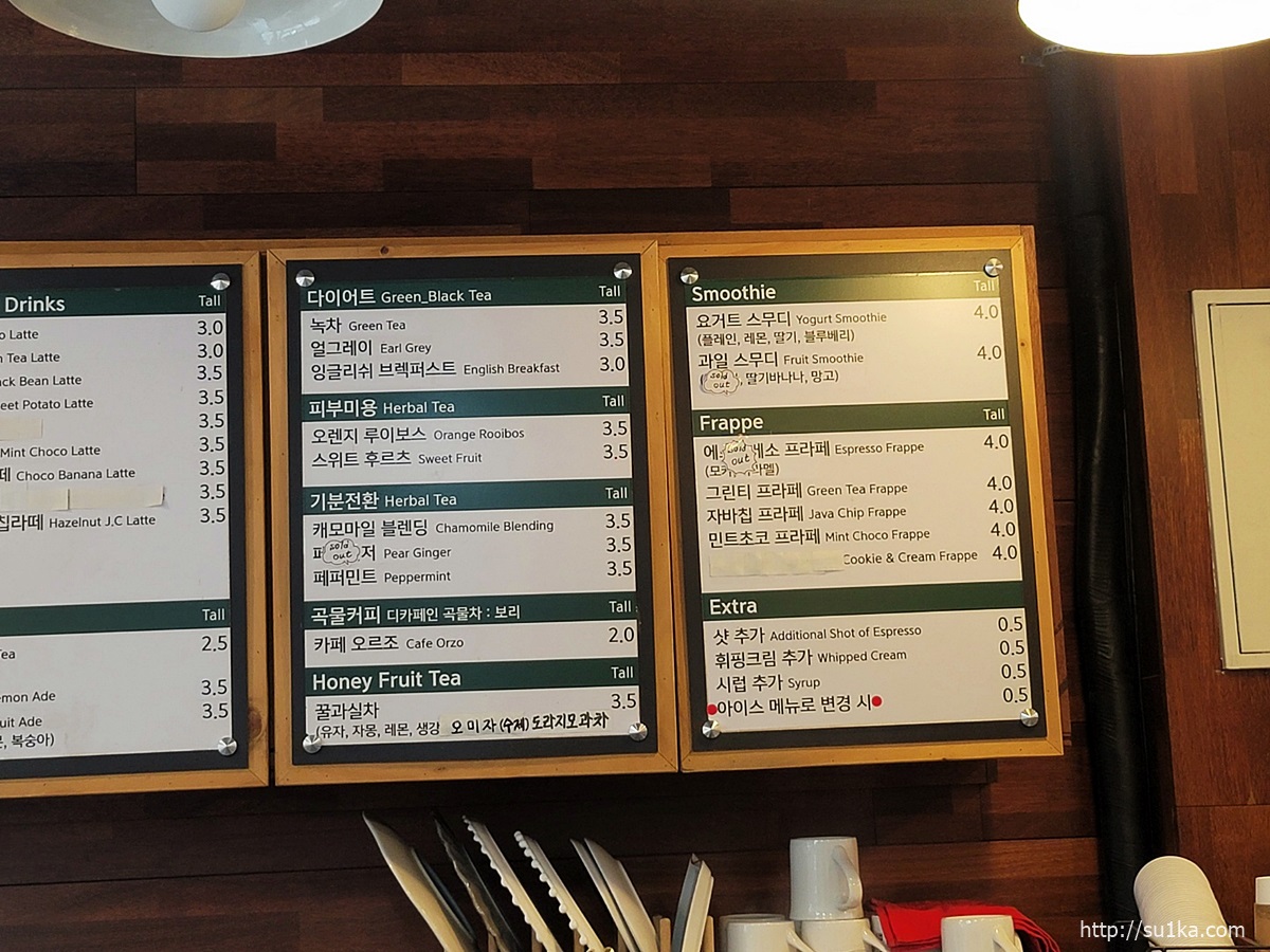 엑스트라 메뉴로 샷추가, 휘핑크림추가, 시럽추가, 아이스메뉴로 변경시 가격이 500원 추가가 된다고 합니다.