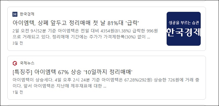 그래서 정리매매 투자는 폭탄돌리기라고 불리기도 할만큼 위험합니다. 아이엠텍 주가는 상장폐지를 앞둔 첫날에는 81%대로 급락하기도 하였습니다.