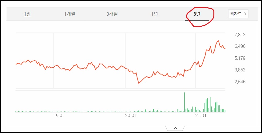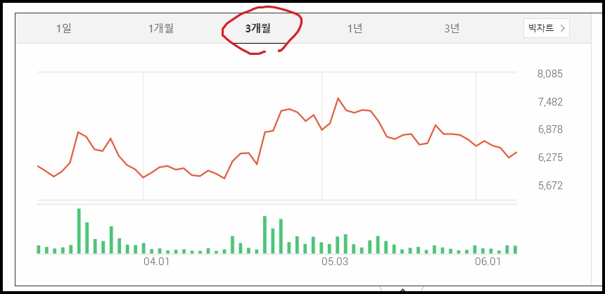 3개월치 차트인데요 5월쯤 고점을 찍고 조금 내려온 모습입니다. 주가는 7000원대까지는 갔었지만 역시나 만원까지는 가지못한 모습이고요.